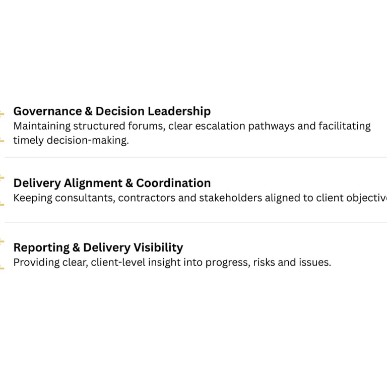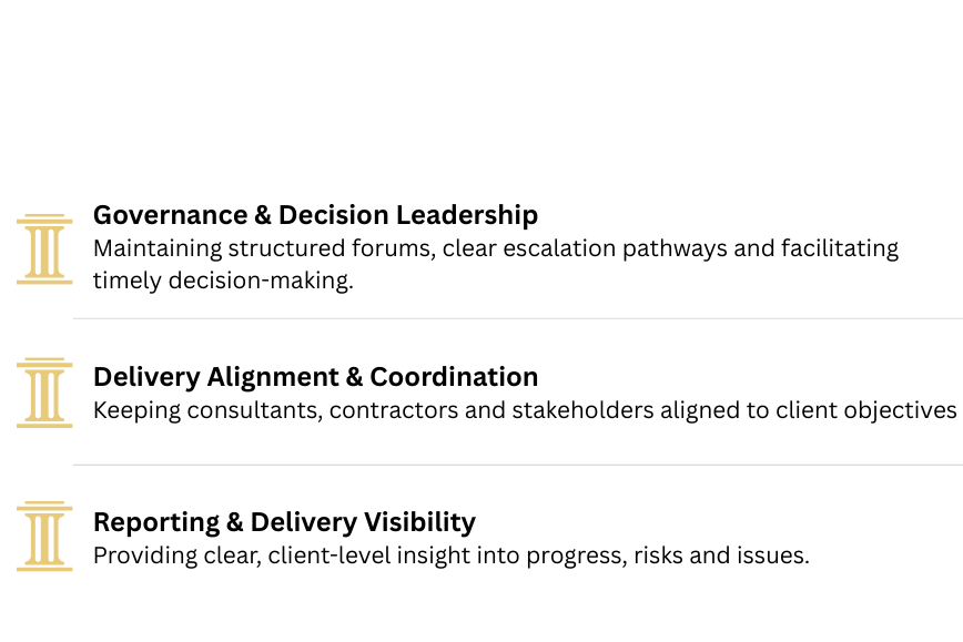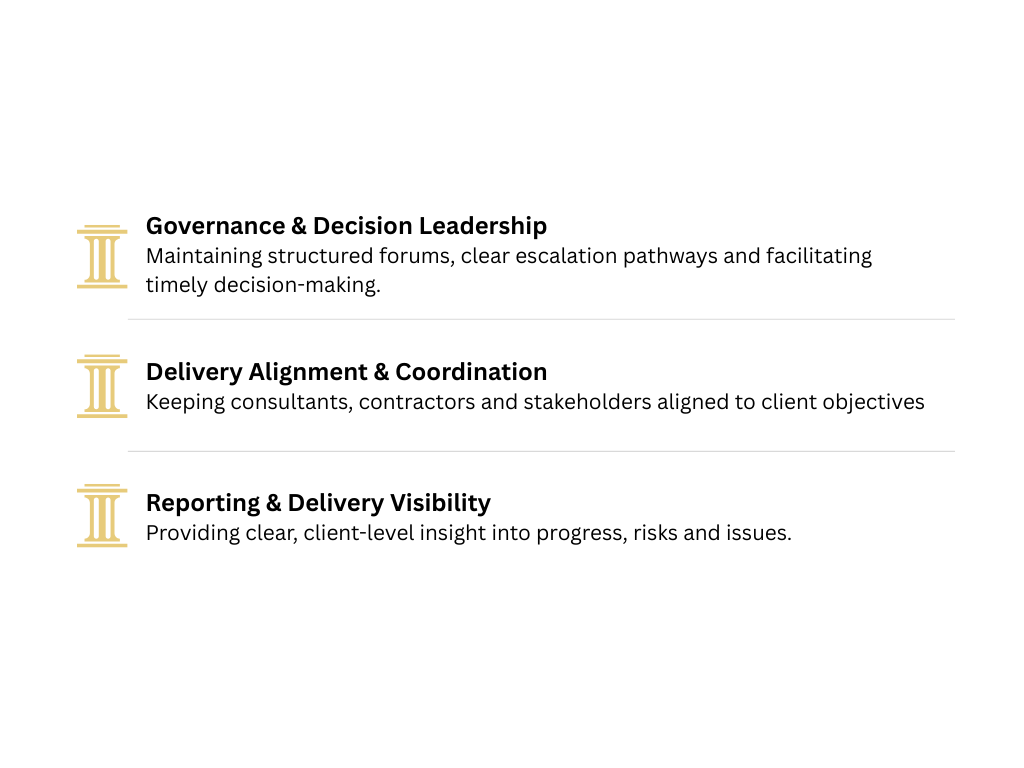 We align stakeholders, remove friction and create the conditions for every delivery partner to perform at their best.