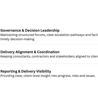 SWPM operates as an independent extension of the client team, maintaining decision clarity, reporting visibility and delivery alignment.